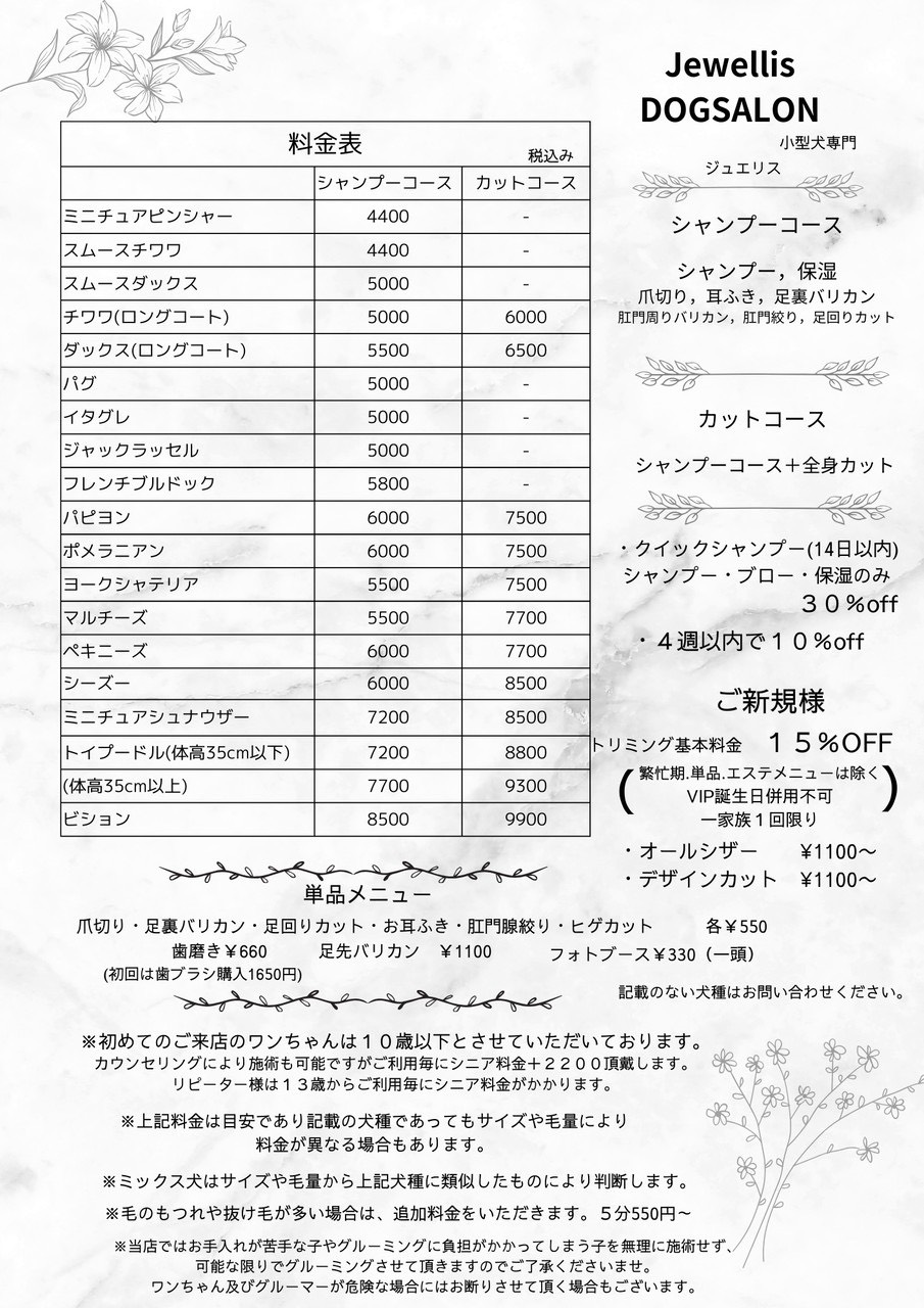当店ではお預かりしてすぐにトリミングは行いません。 事前に仲良し時間を多めにとることで、わんちゃんにはなるべくリラックスしてもらいます。 また、状況によっては休憩を挟む場合もございます。 その為通常よりも多く時間を頂戴する場合がございます。 終わり次第ご連絡いたしますので予めご了承ください。